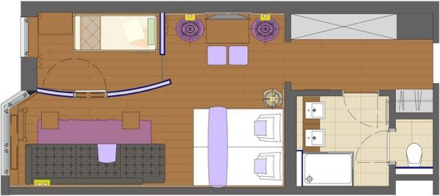 Suite mit Vorraum und Platz für Ihre Garderobe, mit getrenntem Kinderzimmer (mit Stockbett – Maße: 80 x 180 cm), einem abgetrennten stylischen Wohn- Schlafraum mit 2,00 m Betten, behaglichem elegantem Holz-Dielenboden, Kuschel-Couch, sowie Ausstieg zur großen, optisch abgetrennten Gemeinschaftsterrasse.