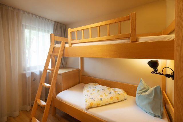 Das Appartement Medium ist ca. 37m² groß mit Schlafraum, kleinem getrennten Kinderzimmer (mit Stockbetten – Maße: 80 x 190 cm), Vorraum, Kästen und Schränke aus hellem Eschenholz, Boden elegant als Holzdielenboden ausgeführt, sowie großem Balkon.