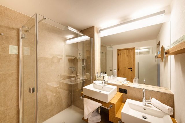 Kombination von zwei Familienzimmern, die über den Vorraum miteinander verbunden sind. Alles was ein Familienzimmer zu bieten hat gibt es hier also doppelt. Einrichtung: Stylischer Wohn- Schlafraum mit Zustellbett, gemütliche Sitzecke mit Kuschel-Couch, Vorraum, Kästen und Schränke, Boden elegant als Holz-Dielenboden ausgeführt