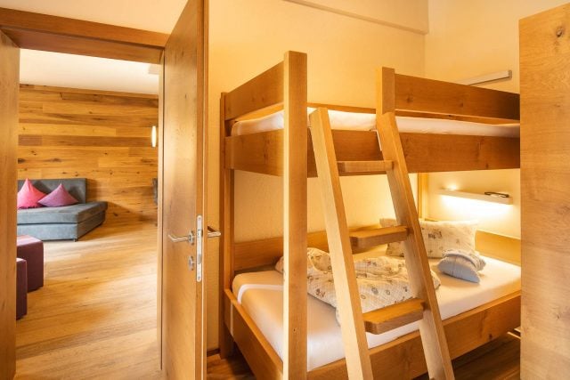 Mit Vorraum und begehbarem Kleiderschrank, 2 getrennten Kinderzimmern mit Stockbetten, Maße – 80 x 190 cm, und je einem Flat-TV. Gemütlicher, stylischer Wohn-Schlafbereich für die Eltern mit Kuschel-Couch, eleganten Lounge-Chairs, Boden elegant als Holz-Dielenboden ausgeführt.