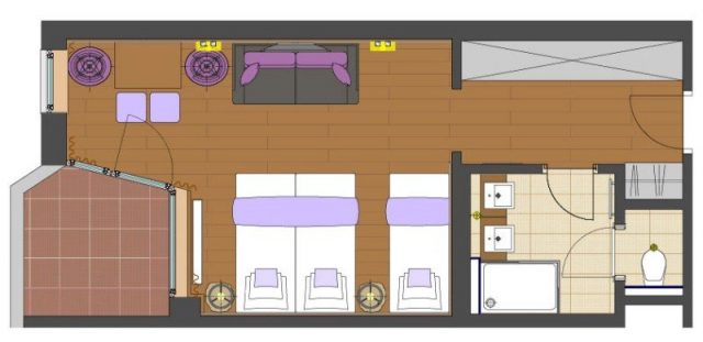 Das Familienzimmer verfügt über Wohn-Schlafraum mit Zustellbett, gemütliche Sitzecke mit Kuschel-Couch (Kuschel-Couch als weiteres Bett nutzbar), Vorraum, Kästen und Schränke aus hellem Eschenholz, Boden elegant als Holz-Dielenboden ausgeführt, sowie großem Balkon bzw. Loggia.